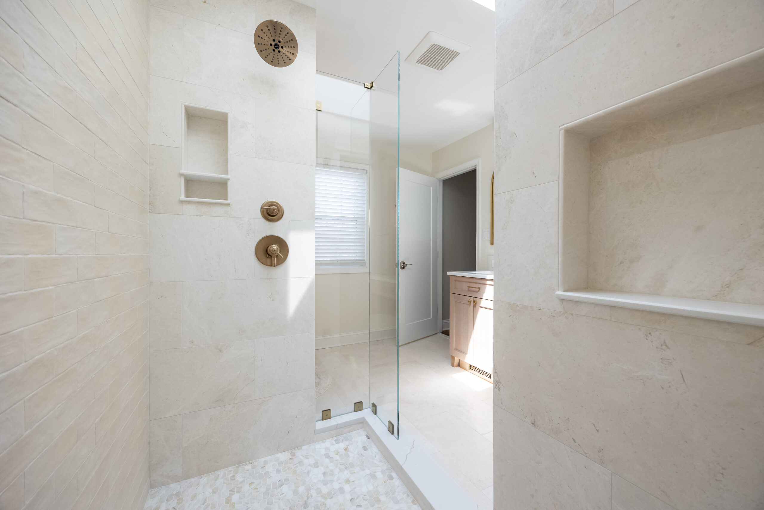 In the bathroom, we replaced the oversized tub with a spacious step-in shower, double vanity, heated floors, and updated fixtures throughout.