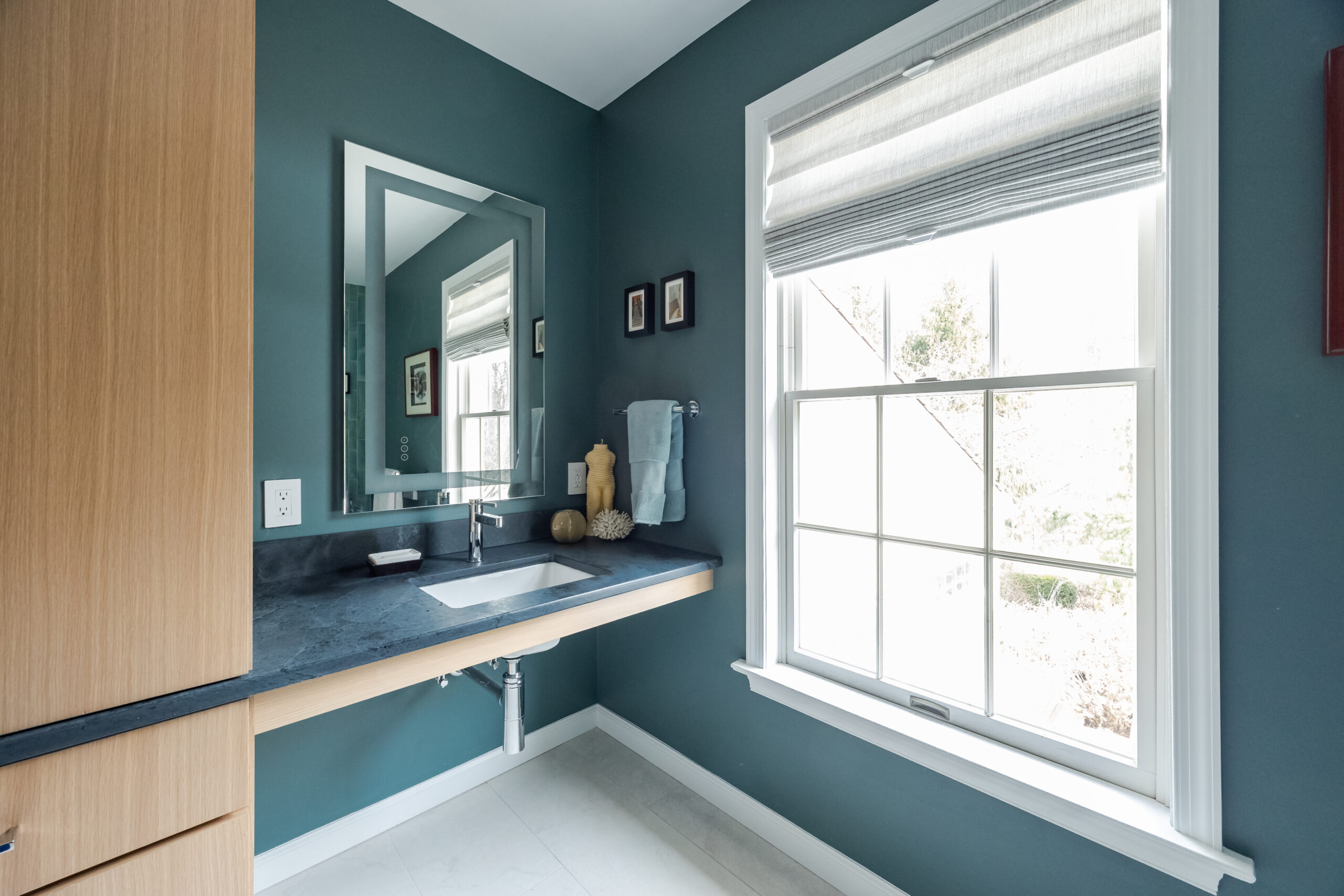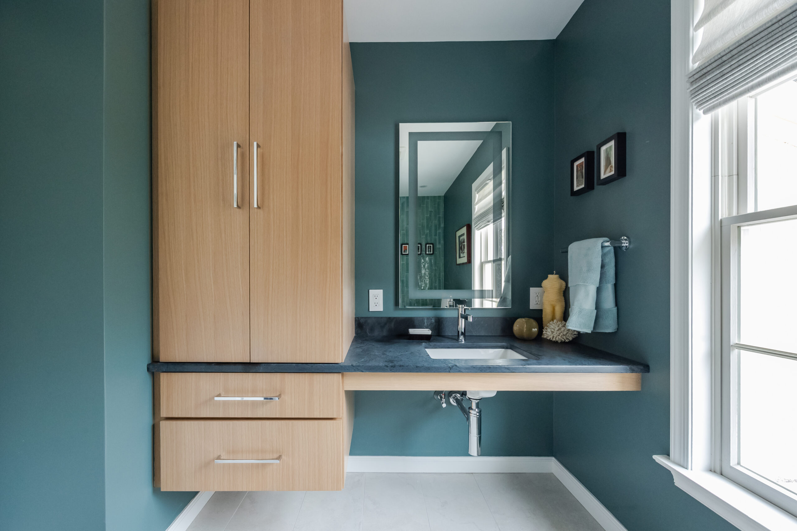 Our clients wanted a peaceful, Zen-like retreat, full of light and maybe a bit of drama. So we stripped a large, 80s-influenced bathroom down to the studs, removing a massive whirlpool tub no one ever used. In its place? A Japanese teak soaking tub. Soapstone counters and benches. A floating vanity. A glass-walled shower. Calming perfection!