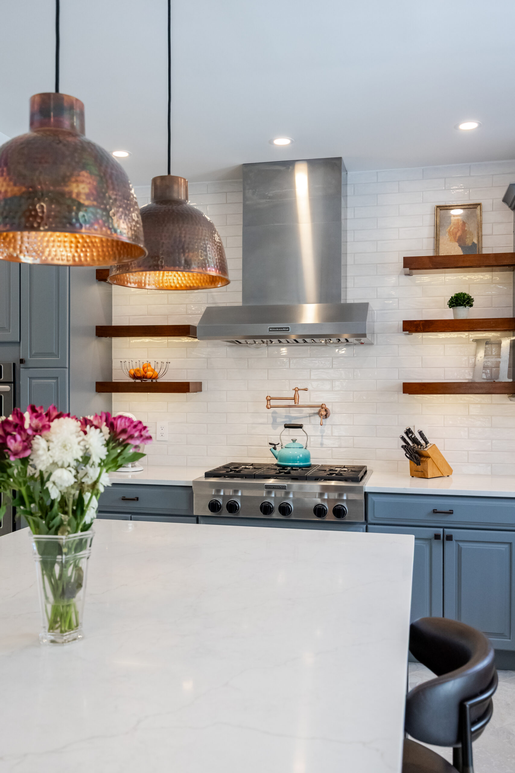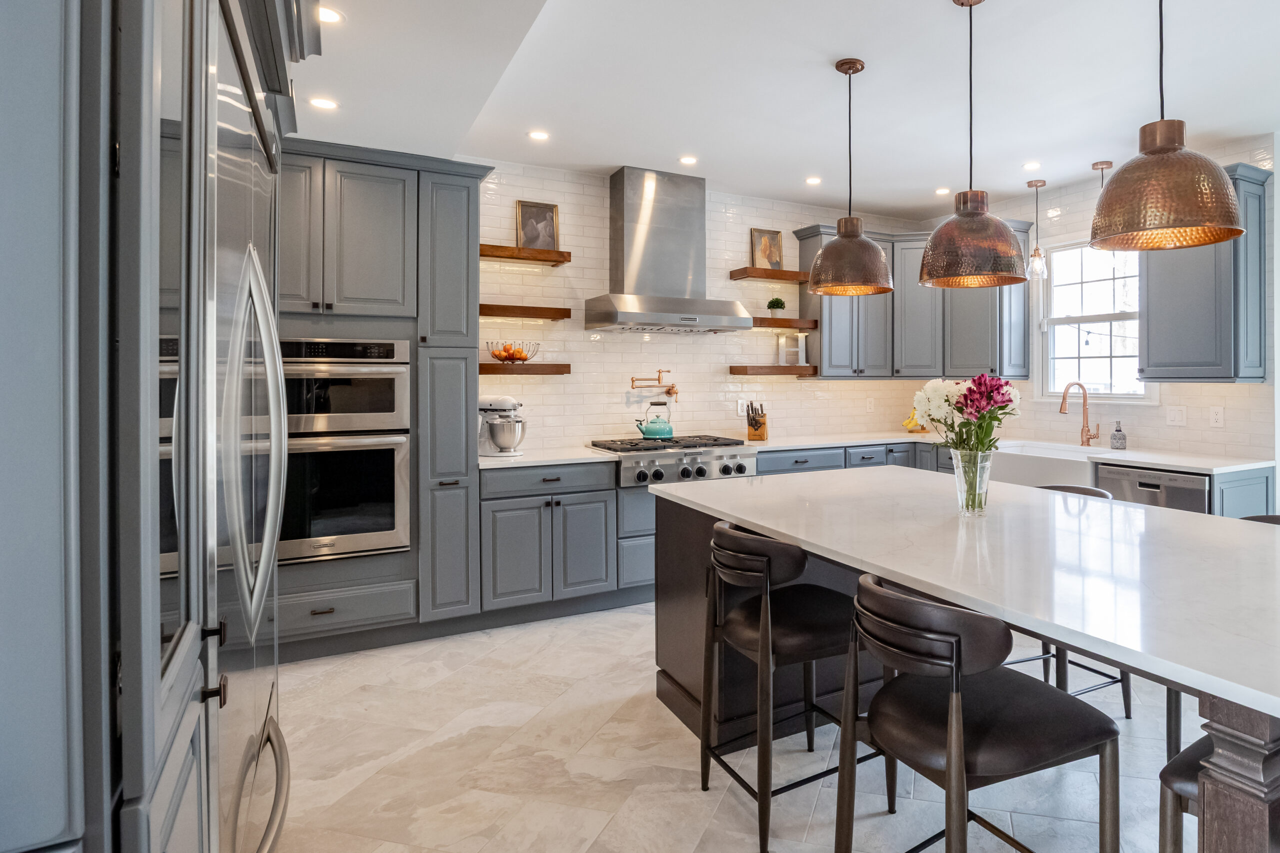 These clients, who consider themselves “longtime flippers,” wanted a new kitchen to better accommodate entertaining and cooking holiday feasts for large family gatherings. Light wood floors, Shaker cabinets, a dramatic island, and some interesting custom tilework created just the right space for their family.