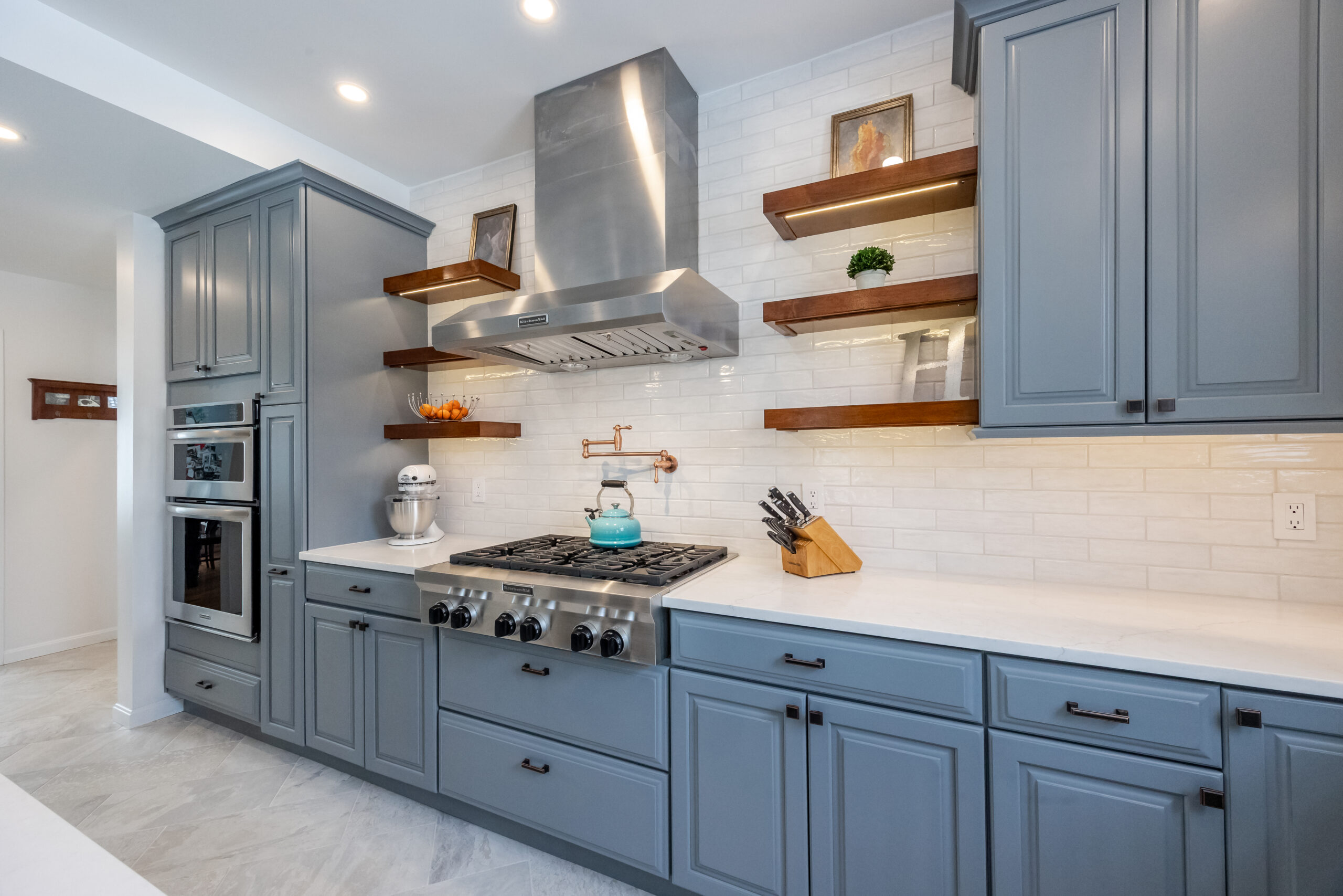 High-quality materials, including a custom tile backsplash behind the cooktop and light gray subway tiles, lend quiet sophistication.