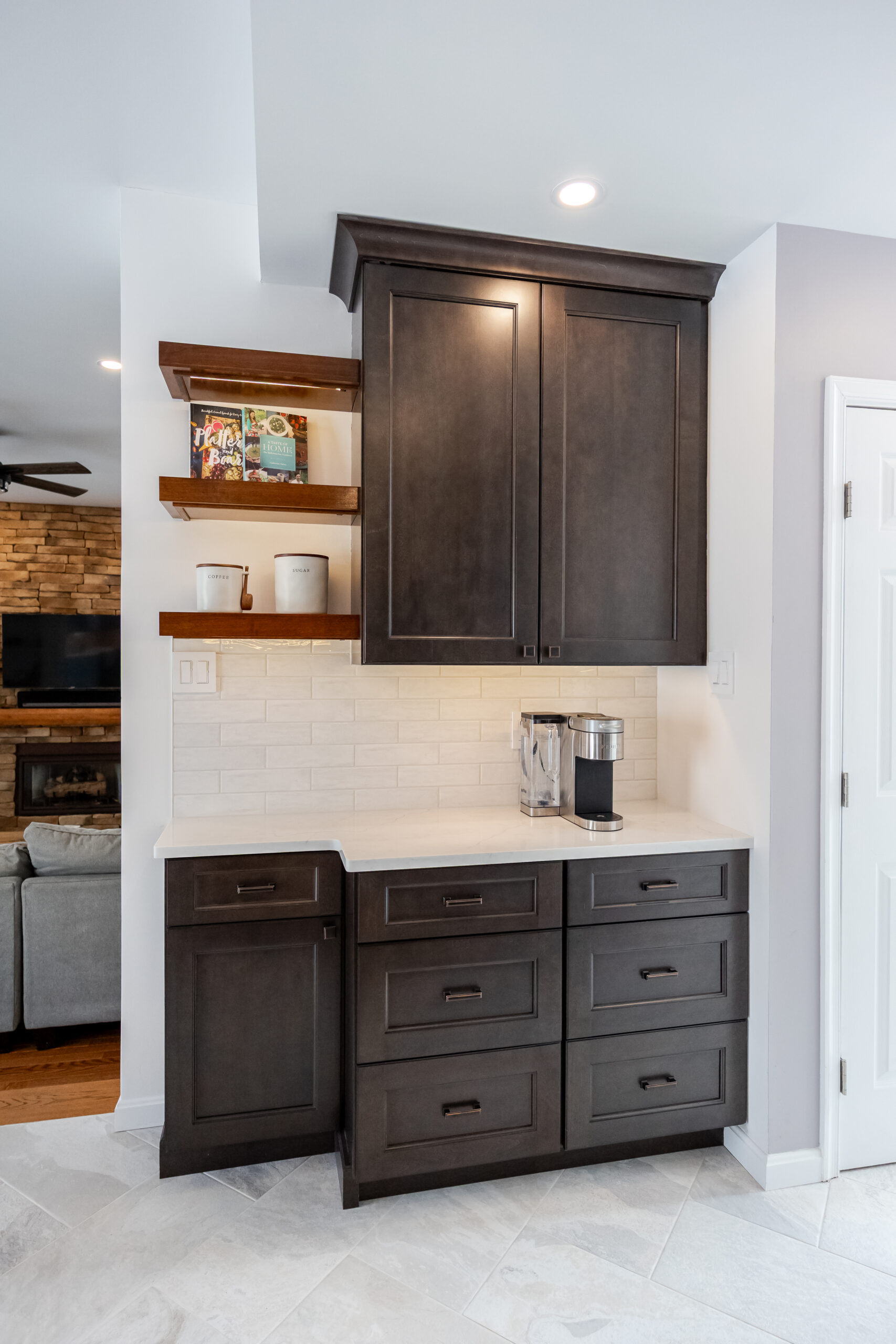 Diane and Keith were ready for a change. Their kids had grown and it was the perfect time to update the home they loved. Contrasting cabinets, a Carrara marble backsplash, and a slew of other high-end finishes made this space sing. We also designed a new fireplace surround and built-in bookcases for the family room to tie the rooms together.